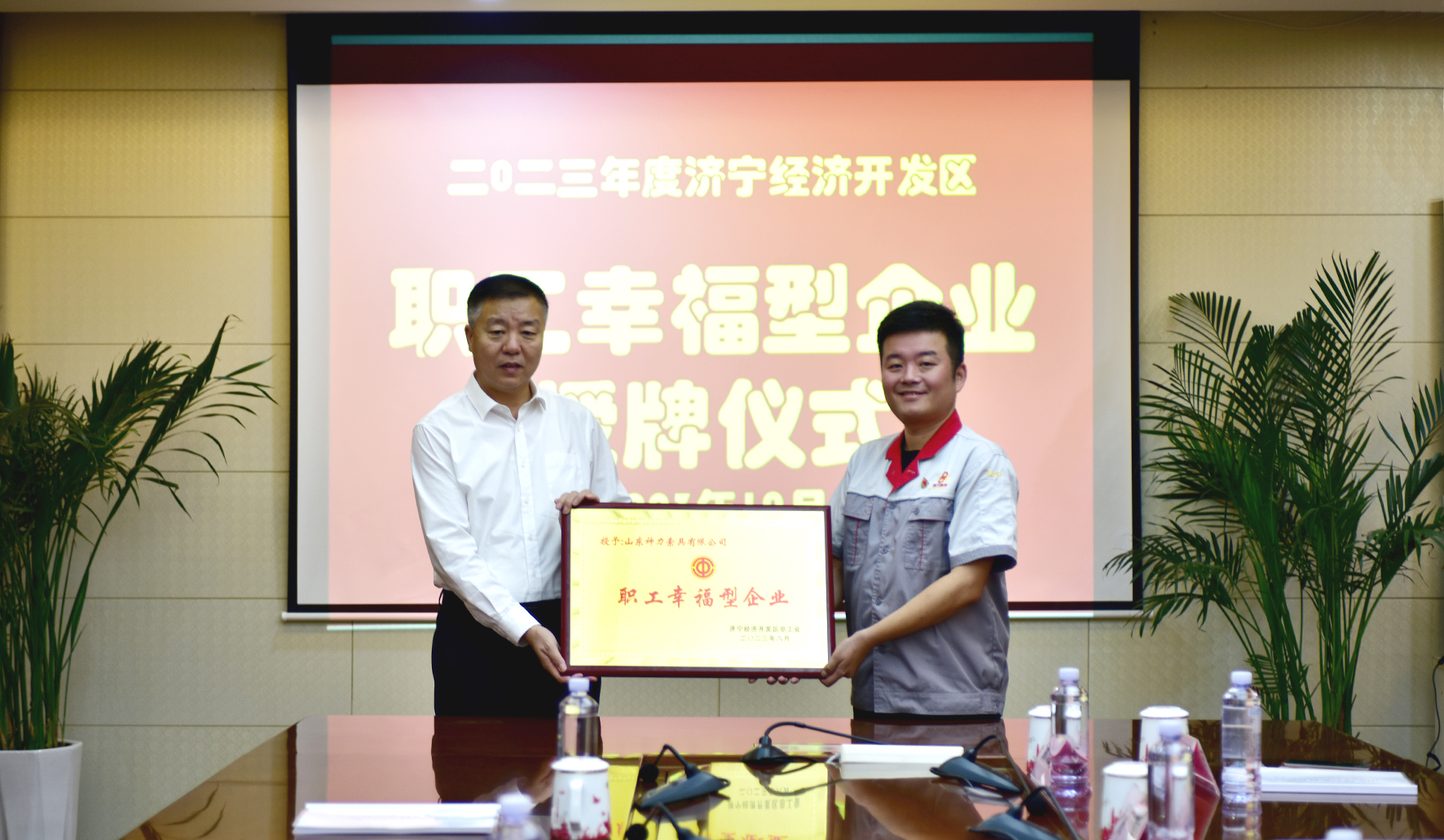 10月11日,濟(jì)寧市商貿(mào)物流園區(qū)管理服務(wù)中心副主任、區(qū)總工會(huì)主席盛春亭,區(qū)總工會(huì)常務(wù)副主席徐紅英一行來我司舉行“職工幸福型企業(yè)”授牌儀式。